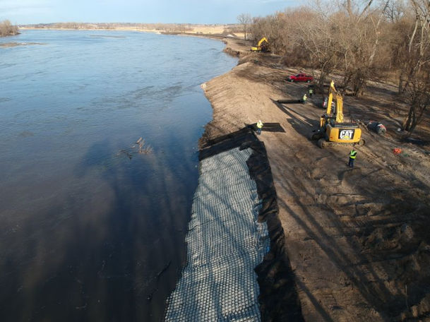 The rolls were delivered to the project site, tagged with the specific dimension and with the corresponding mat layout number. Each roll was 15.5’ wide and included a 12” geogrid extension to seamlessly overlap the subsequent mats. The overlap seams were secured in 1’ increments with stainless steel zip ties. The mats extended into the Platte River 5’ beyond normal pool elevation. At the crest of the slope, the mats were recessed into an anchor trench. The installation of Flexamat® was completed in one-week.