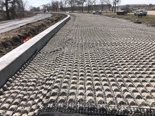 Flexamat 10NW a été choisi pour blinder la digue afin d'éviter l'érosion lorsque la digue est franchie et franchie. Des rouleaux de 16' de large de Flexamat 10 NW ont été installés, comprenant une géogrille et une extension géotextile le long du bord du tapis pour que les tapis suivants se chevauchent.